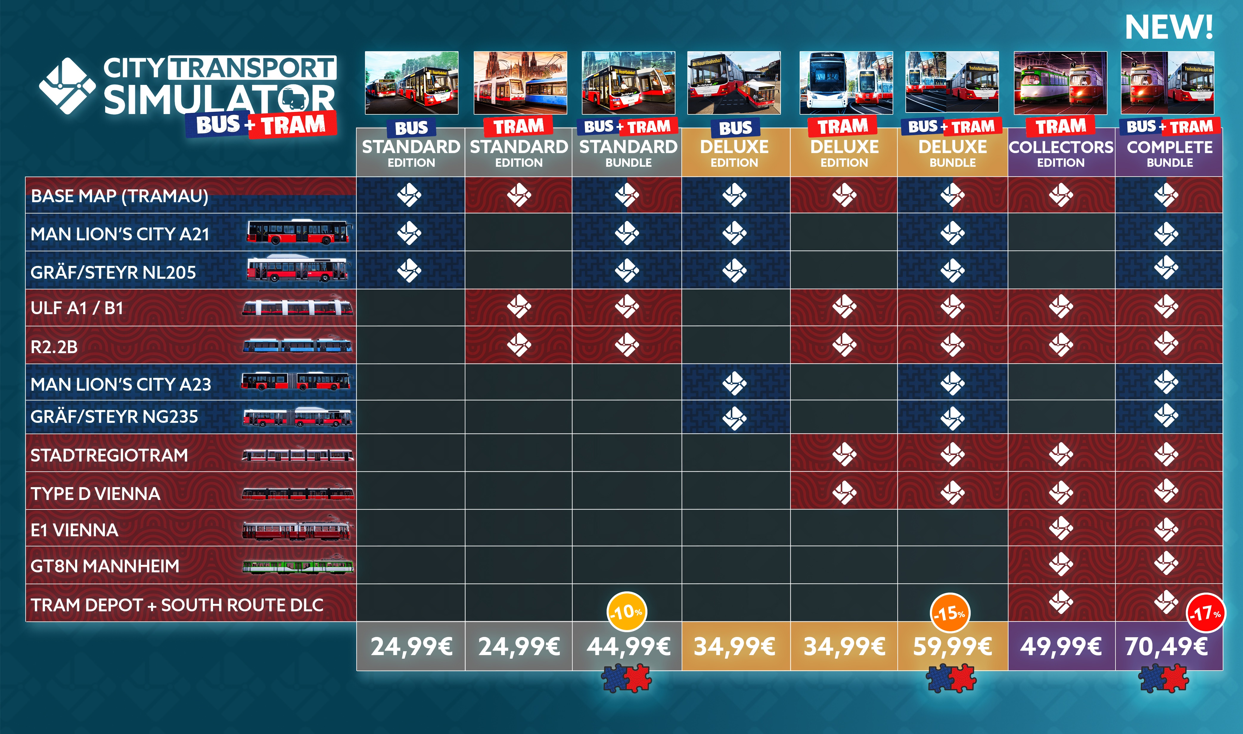 City Transport Simulator ist die technische Basis für mehrere eigenständige Spiele – CTS: Bus sowie CTS: Tram. Beide Titel können unabhängig voneinander gespielt werden. Du brauchst also nicht CTS: Tram, um CTS: Bus nutzen zu können – und umgekehrt. Je nach Wunsch, kannst du nur das Bus-Modul kaufen und als Busfahrer in Tramau unterwegs sein. Wenn du nur Bahnfahrer sein möchtest, reicht das CTS: Tram Bundle.
